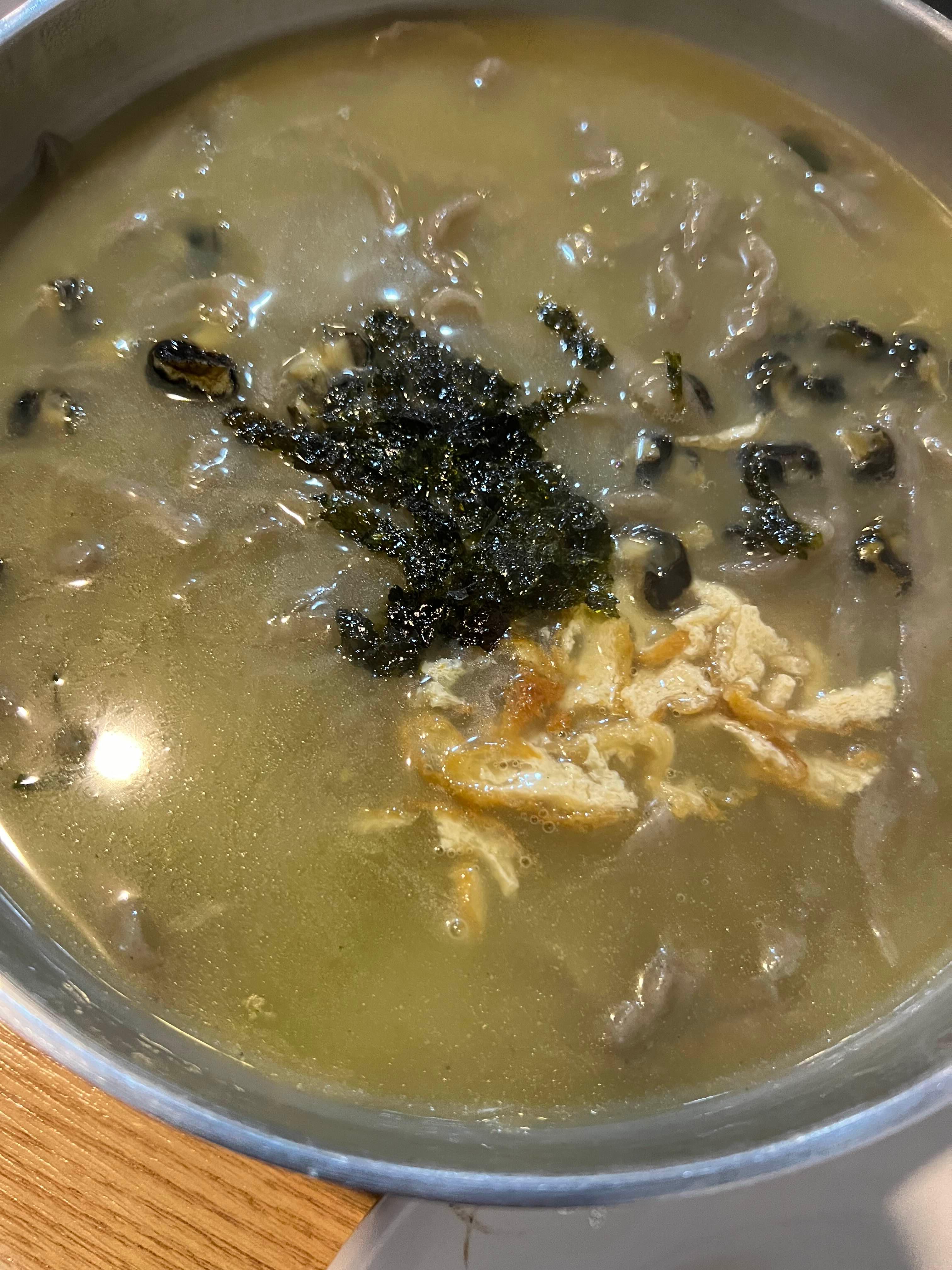 숟가락으로 국수와 국물을 팍팍 드시는 것을 추천드립니다. 참기름향 좋아요. 보말칼국수의 국물은 보말죽보다는 연해서 보말죽을 드시고 보말칼국수를 드세요.