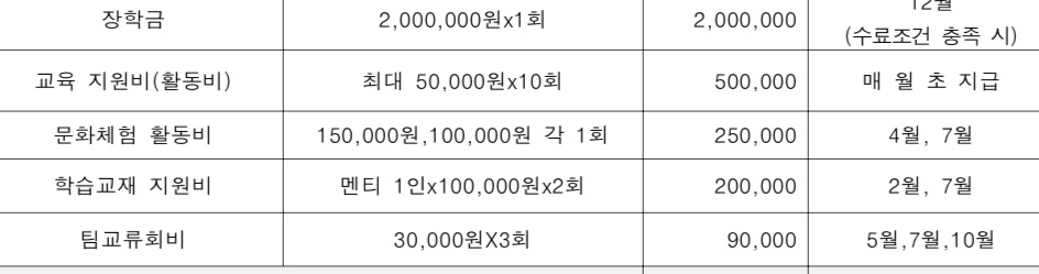 장학금은 12월에 일괄적으로 들어오고, 나머지는 조금씩 멘토링 활동비 등으로 들어오는 것 같습니다.