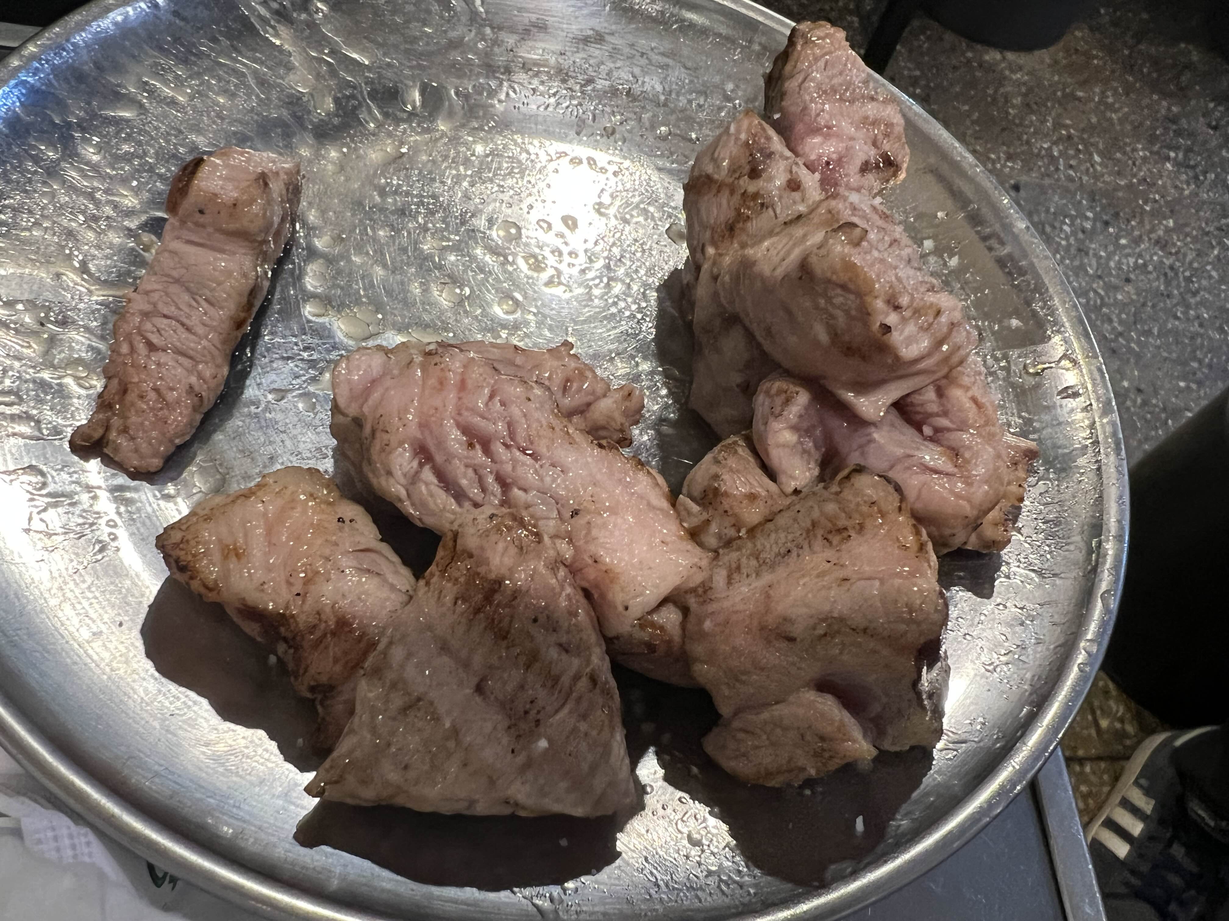 초벌이 된 고기를 받으면 테이블에 더 익혀줍니다.