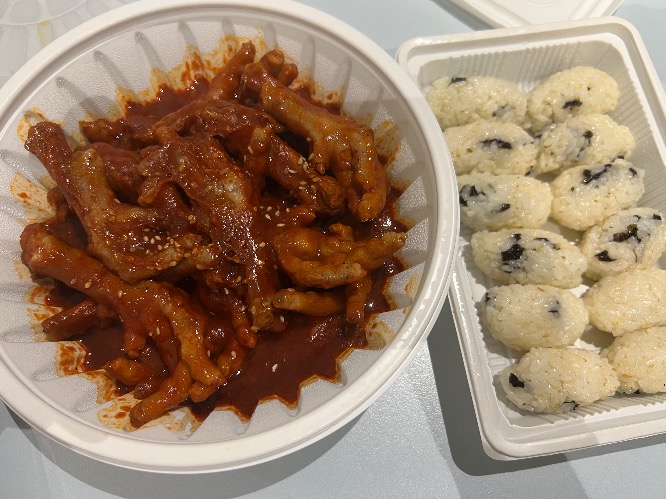 이게 국물닭발은 아니에요. 뭔가 넉넉하게 양념에 무쳐진? 그런 느낌. 젤라틴이 느껴지는 국물! 저는 좀 낯설어서 많이는 못 먹었어욥. 저 주먹밥은 상당히 맛있게 먹었어요.